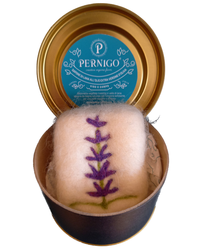 A base d’olio extravergine d’oliva, conferisce alla pelle morbidezza ed elasticità. La saponetta è rivestita di uno strato di lana cardata per incrementare l’azione pulente ed esfoliante grazie alla leggera ruvidezza e alla lanolina contenuta naturalmente nella lana, che rende la pelle liscia e setosa. Evitare il contatto con gli occhi.